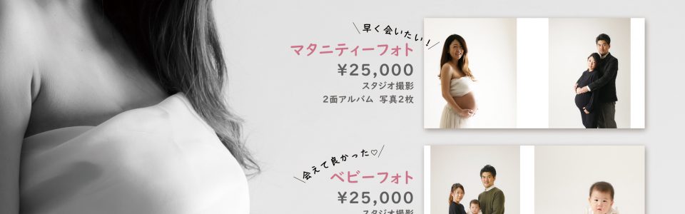 マタニティーフォト・ベビーフォト(各¥25,000税別/スタジオ撮影・2面アルバム)
