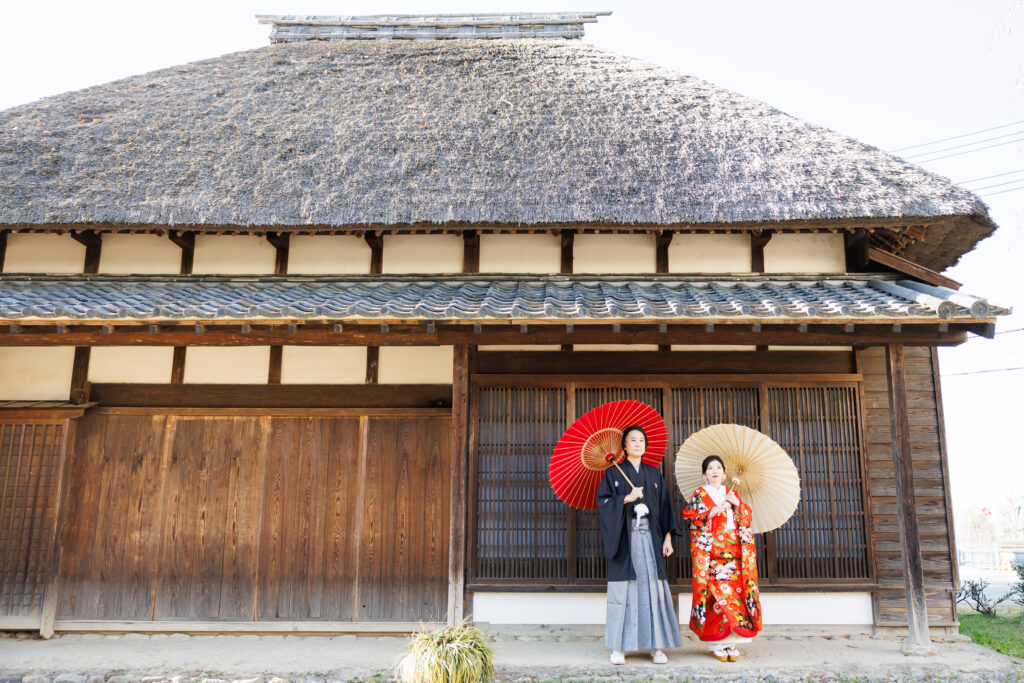 とっても広い敷地に、藁ぶき屋根の古民家が並びます。